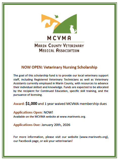 Four $1,000 scholarships will be awarded to applicants who currently work at a veterinary practice in Marin County and demonstrate their commitment to the field and the region.